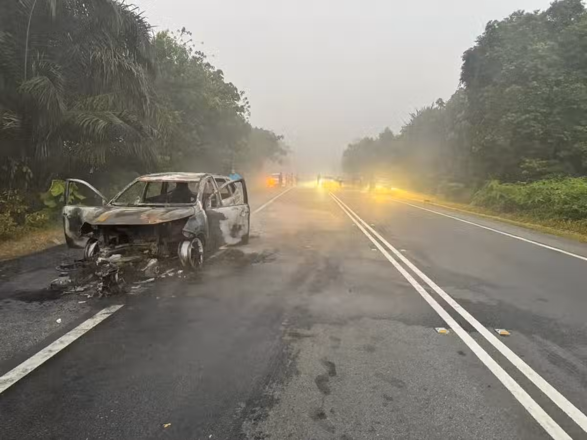 (哥打丁宜30日訊)5輛交通工具連環撞,導致一輛摩哆與其中一輛休旅車雙雙起火,騎士更因受重創,當場不治。
