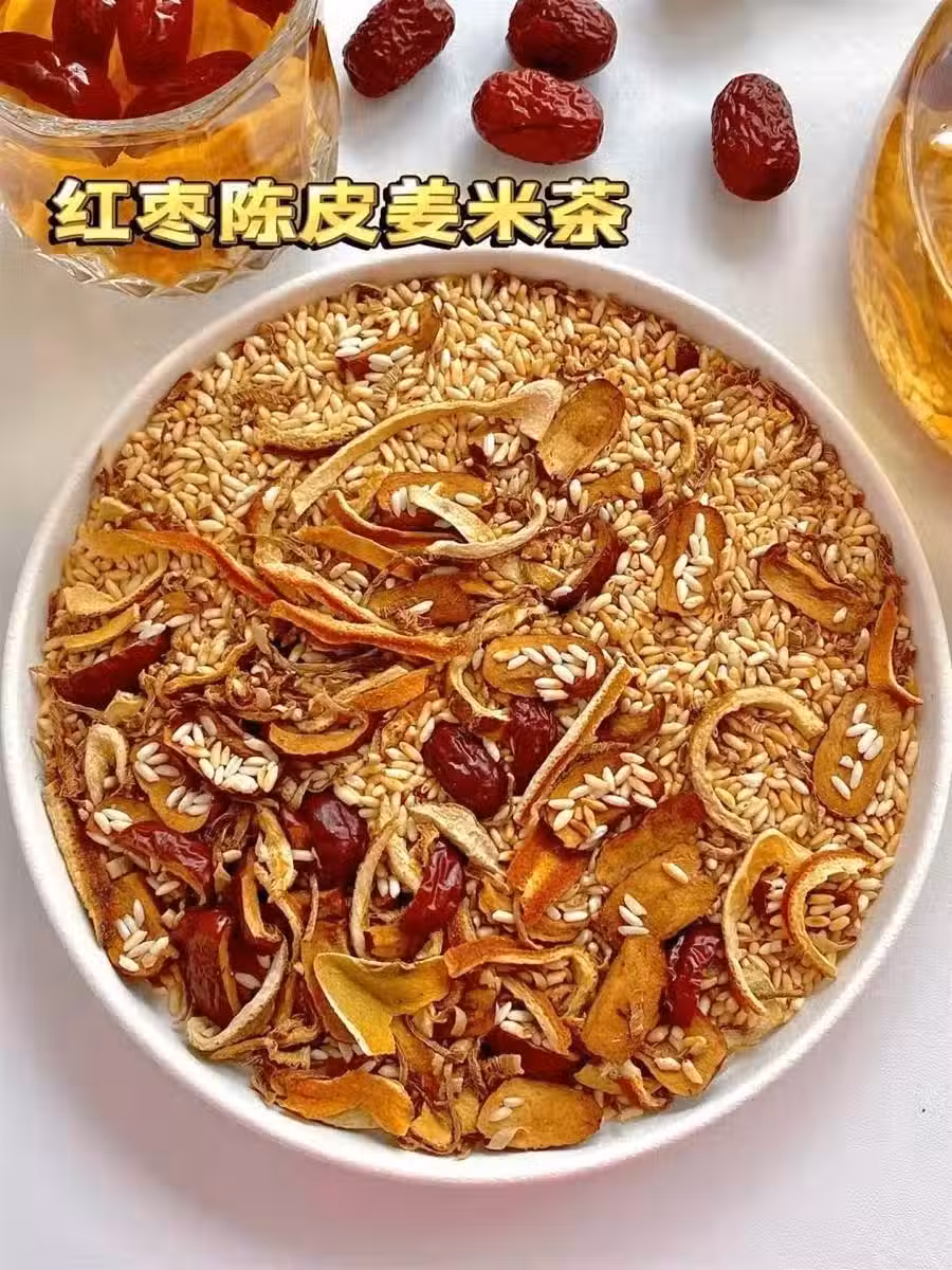86歲的爺爺讓我媽趕緊去炒一些 陳皮紅棗姜米茶給我喝 。