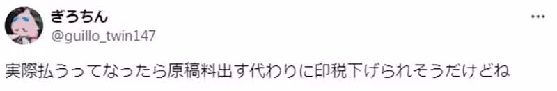 漫畫家坂月さかな:「雖然我有拿(我說不給就不畫),但我發現有這麼多漫畫家都沒拿,真的讓我超震驚。我知道有『已經包含在版稅裡面』這種藉口,但我會認為『每個項目各別分開付,不要全部包在一起』。畢竟不論漫畫或小說,委託設計師設計封面的話,出版社都會好好付人家錢。我們漫畫家也想要被平等對待。」