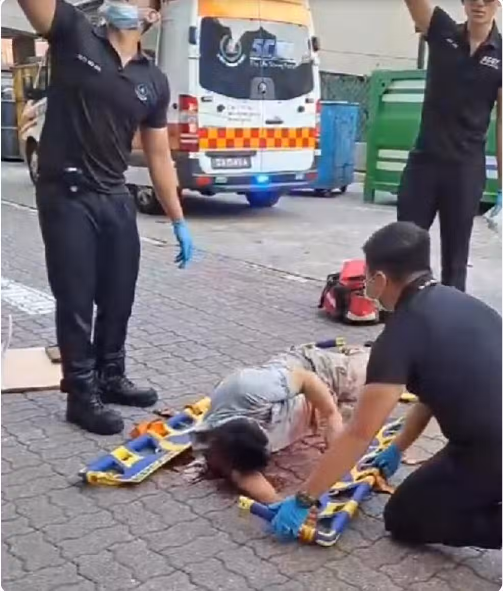 視頻顯示,男子墜在地面後,身上多處流血,頭部也染血,一隻腳不規則地疊在大腿上,疑是腳已經骨折。