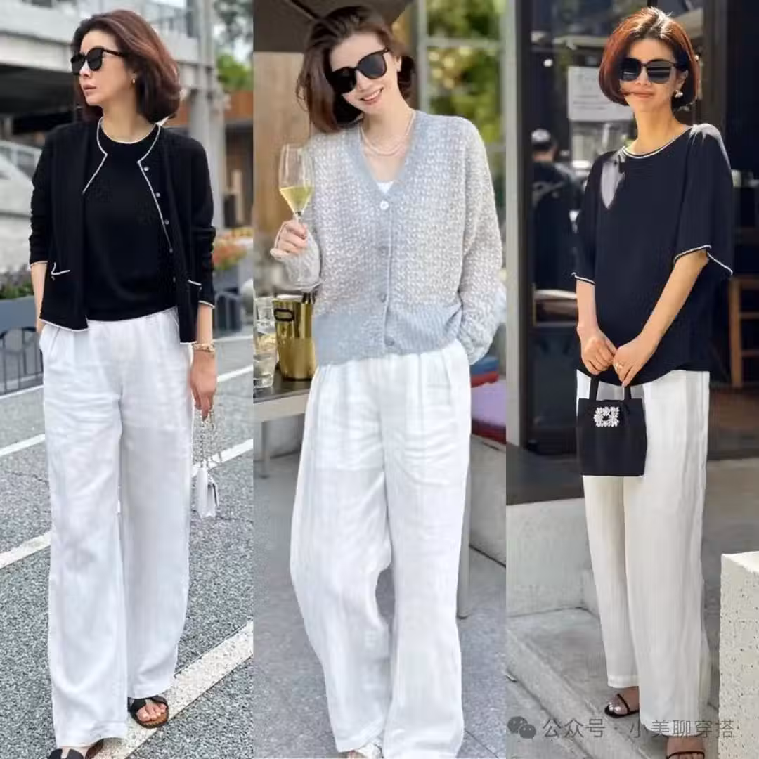 黑色針織開衫,選擇白色闊腿褲,經典的黑白配色,怎麼看都不過時,自帶高級感。