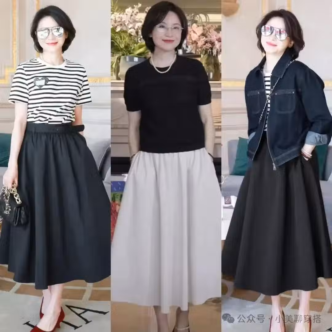 赫本裙是特別適合中年女性穿的裙子,它呈傘狀,也叫做傘裙,對於梨形身材的女生格外友好,搭配修身一些的上衣,更顯瘦。