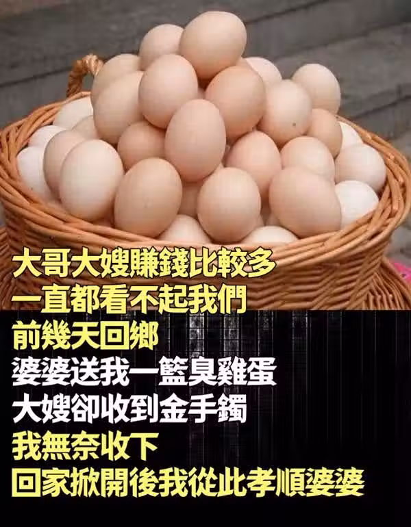 大哥大嫂賺錢比較多,一直都看不起我們。前幾天回鄉,婆婆「送我一籃臭雞蛋」大嫂卻收到金手鐲,我無奈收下回家掀開後我從此孝順婆婆...
