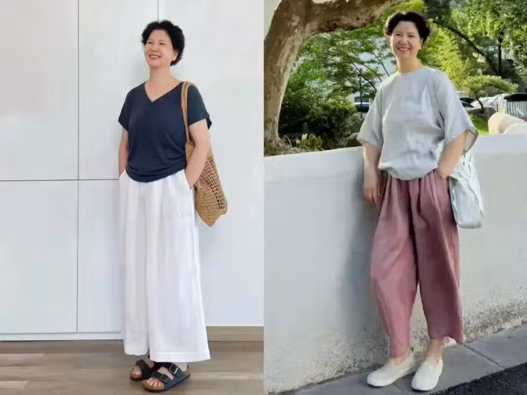 五六十歲的女人穿T恤時,儘量不要搭配短褲、牛仔褲,換成這些會更洋氣高級
