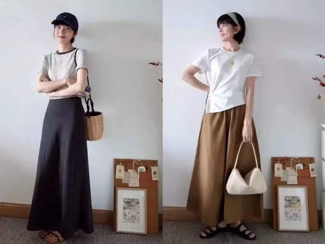 五六十歲的女人穿T恤時,儘量不要搭配短褲、牛仔褲,換成這些會更洋氣高級