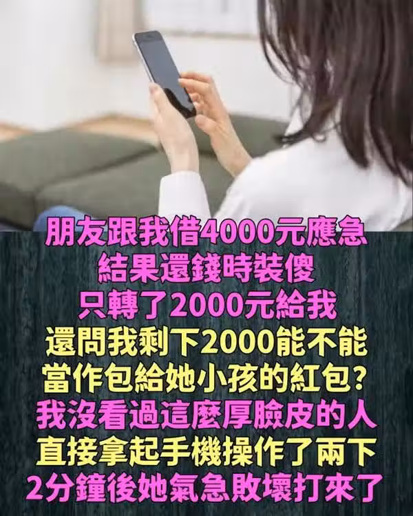 朋友跟我借4000元應急,結果還錢時裝傻只轉了2000元給我,還問我剩下2000能不能當作包給她小孩的紅包?我沒看過這麼厚臉皮的人,直接拿起手機「操作了兩下」,2分鐘後她氣急敗壞打來了!