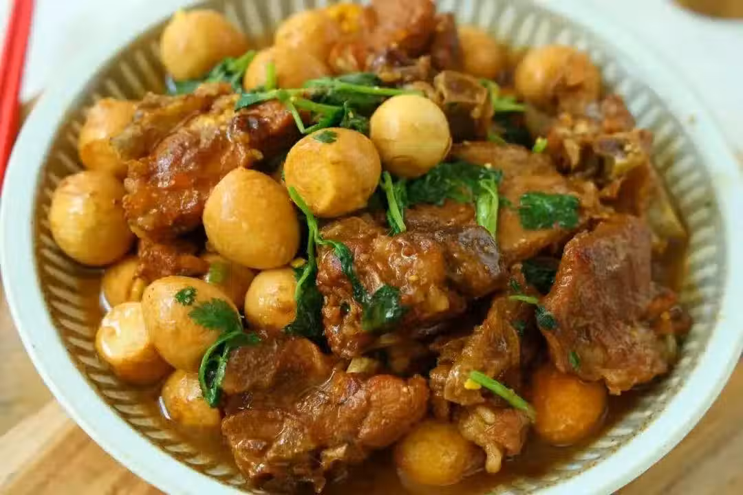 而這道菜的最大魅力,還在於其獨特的口感。經過精心焯水去腥的排骨,在冷油冷鍋中與冰糖共舞,炒制出誘人的糖色,不僅為排骨披上了一層金黃的外衣,更增添了絲絲甘甜。隨後,生抽、老抽等調味料的加入,讓排骨的每一寸都深深浸潤了醬香,外焦里嫩,鮮美異常。而提前煮熟的鵪鶉蛋,在長時間的燉煮中吸收了排骨的精華與湯汁的醇厚,變得軟糯可口,一口咬下,滿口留香,讓人回味無窮。
