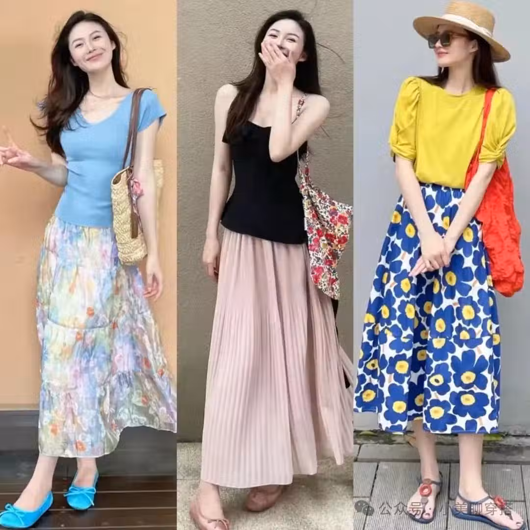 黑色弔帶搭配櫻花粉色的百褶長裙,溫柔而嫵媚,特別有女人味。海藍色的針織衫,搭配同色系的印花長裙,輕盈又浪漫,特別適合夏天度假時穿。