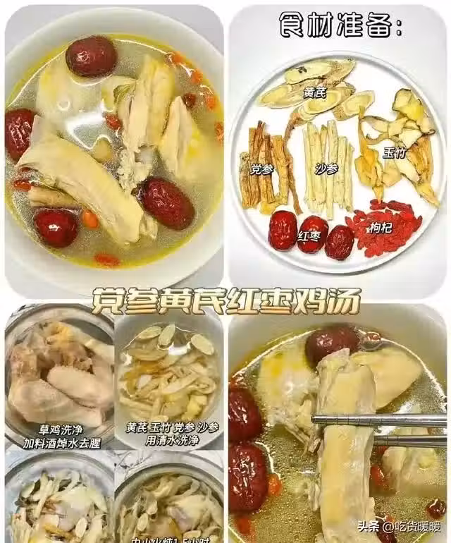 口把所有藥材用清水洗凈, 老母雞砍塊洗凈泡30min 加薑片焯水備用3所有食材放入燉盅, 加適量清水燉2小時 4出鍋加適量鹽調味。