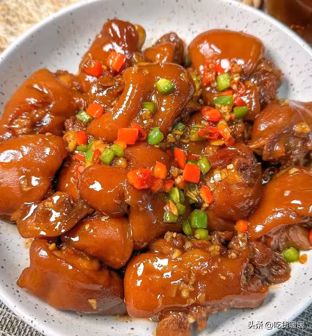 蔥姜料酒焯水撈出洗凈 用廚房紙巾吸干水分 一勺料酒 一勺蚝油 油熱放冰糖炒至棗紅色 放豬蹄翻炒裹上糖色 2勺老抽上色 一勺黃豆醬炒勻 加入蔥姜八角等香料炒香。