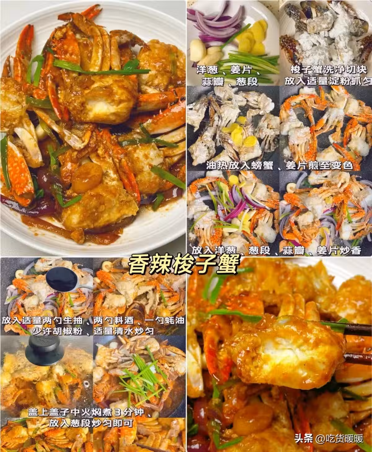 洋蔥、薑片、 梭子蟹洗凈切塊蒜瓣 蔥段 放入適量澱粉抓勻油熱放入螃蟹、薑片煎至變色香辣梭子蟹 放入洋蔥、蔥段、蒜瓣、薑片炒香放入適量兩勺生抽、兩勺料酒 一勺蚝油少許胡椒粉、適量清水炒勻蓋上蓋子中火燜煮3分鐘放入蔥段炒勻即可