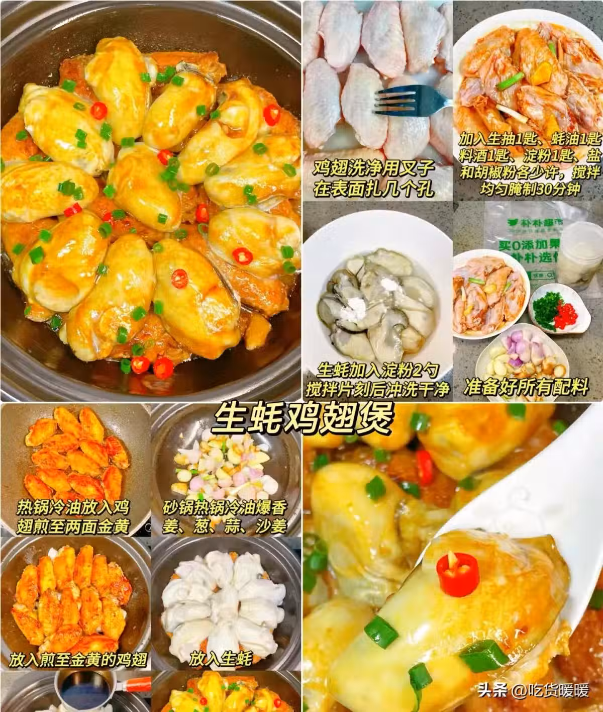 加入生抽1匙、蚝油1匙料酒1匙、澱粉1匙、鹽雞翅洗凈用叉子 和胡椒粉各少許,攪拌在表面扎幾個孔 均勻腌制30分鐘補補超市買0添加果朴選加入澱粉2勺攪拌片刻後沖洗乾淨準備好所有配料生蚝雞翅煲熱鍋冷油放入雞 砂鍋熱鍋冷油爆香翅煎至兩面金黃 姜、蔥、蒜、沙姜放入煎至金黃的雞翅 放入生蚝倒入醬汁:生抽1匙、料酒1匙、蚝油半匙、好吃火煮開後轉小火煮3分鐘清水2匙、砂糖少許,大蔥花就可以了出鍋前撒入小米辣、