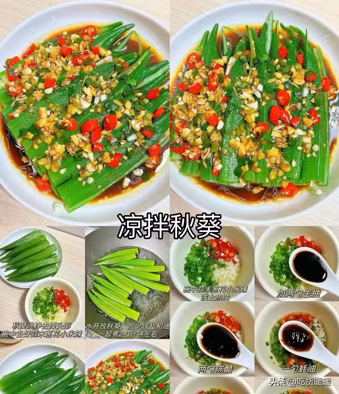 兩勺陳醋 一勺蚝油 雞 對半切開擺盤放好秋葵撈出用冷水沖洗淋上料汁就可以開吃啦適量鹽 少許雞精一起攪拌均勻。