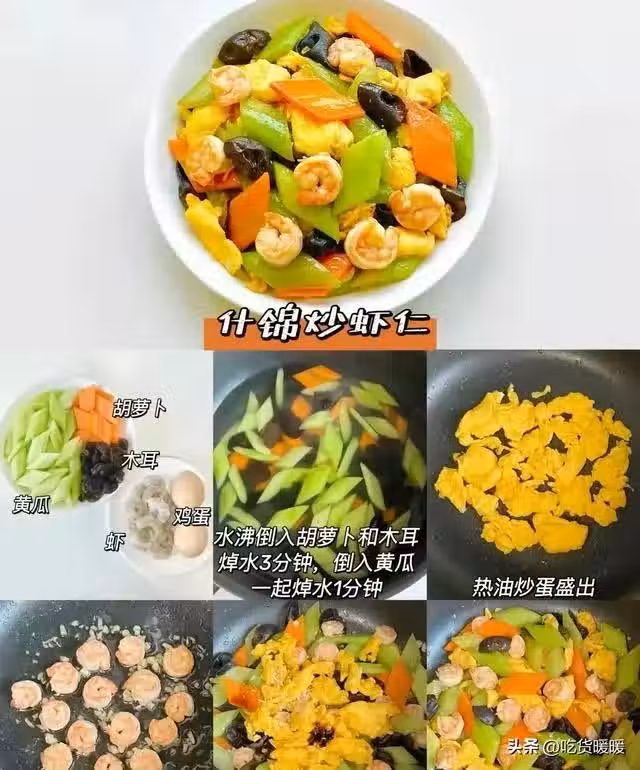 焯水3分鐘,倒入黃瓜一起焯水1分鐘 熱油炒蛋盛出 蝦仁加少許料酒和生抽 ,腌制10分鐘熱油炒香倒入蔬菜和雞蛋, 蒜末,倒入蝦仁炒熟鹽、生抽、蚝油、雞精 翻炒均勻入味。