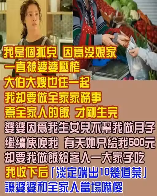 我是個孤兒,因為沒娘家一直被婆婆壓榨!大伯大嫂也住一起我卻要做全家家務事、煮全家人的飯…才剛生完「婆婆因為我生女兒不幫我做月子」繼續使喚我! 有天她只給我500元「卻要我做飯給客人一大家子吃」,我收下後「淡定端出10幾道菜!!!!!