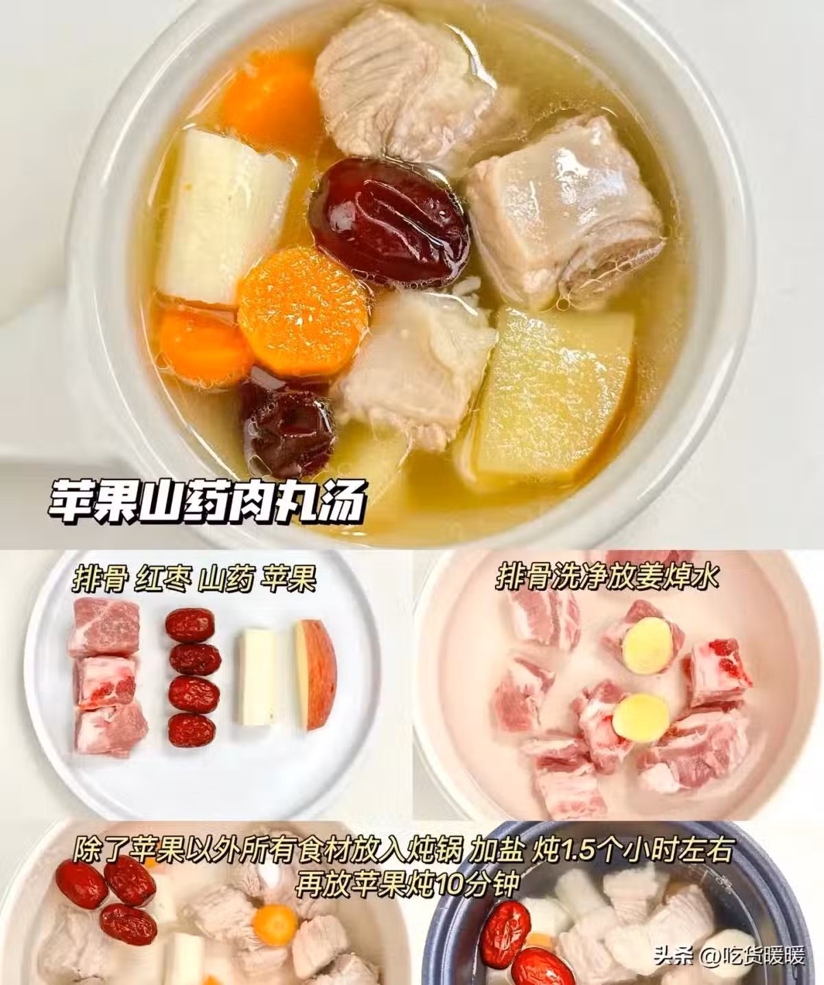 排骨 紅棗 山藥 蘋果 排骨洗凈放姜焯水 除了蘋果以外所有食材放入燉鍋 加鹽 燉1.5個小時左右
