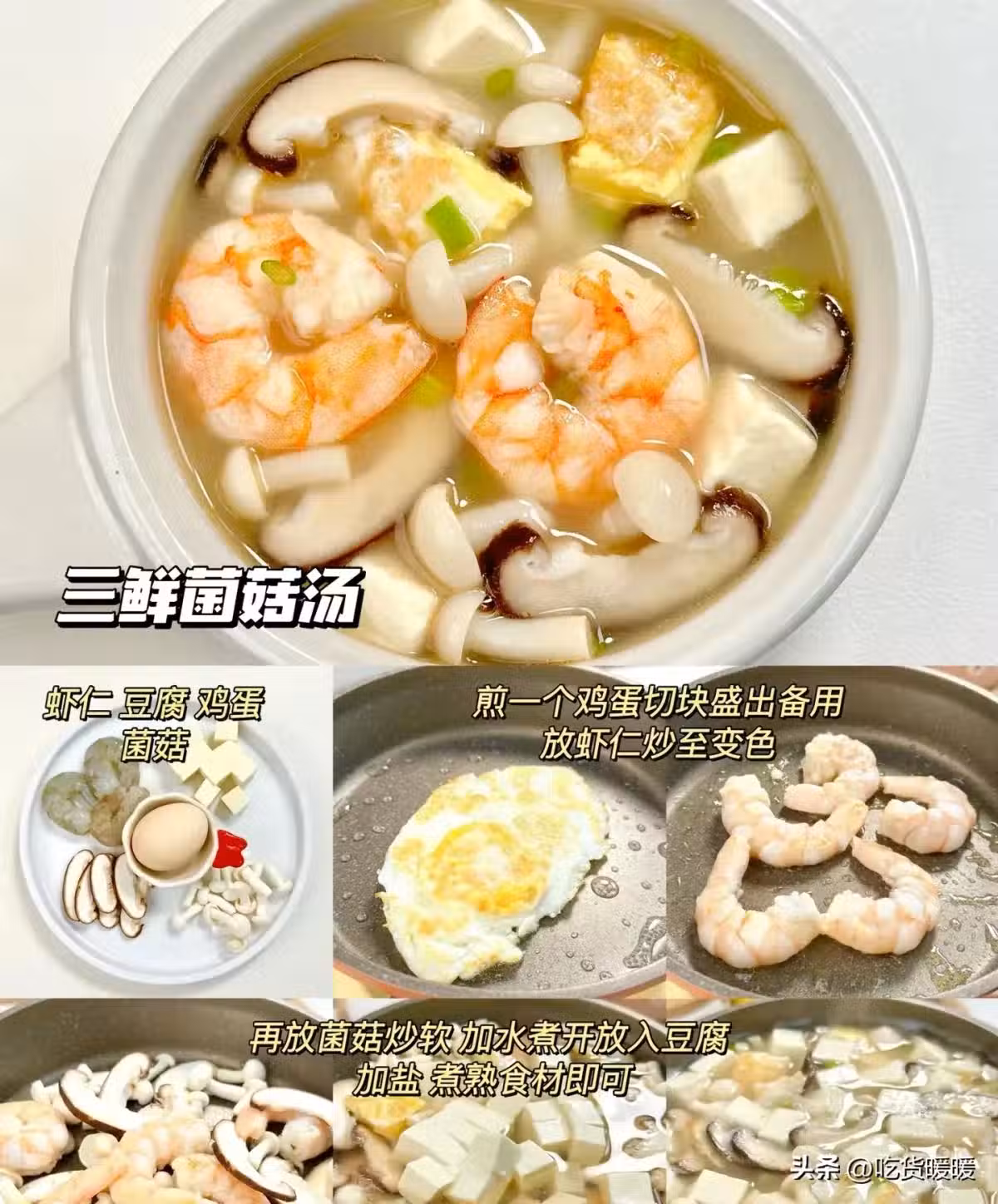 菌菇 放蝦仁炒至變色 再放菌菇炒軟加水煮開放入豆腐加鹽 煮熟食材即可。