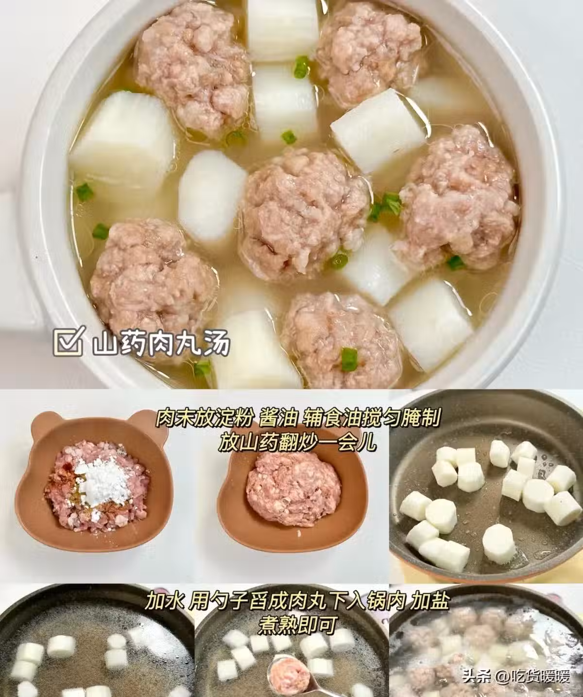肉末放澱粉 醬油 輔食油攪勻腌制放山藥翻炒一會兒加水用勺子舀成肉丸下入鍋內加鹽煮熟即可。