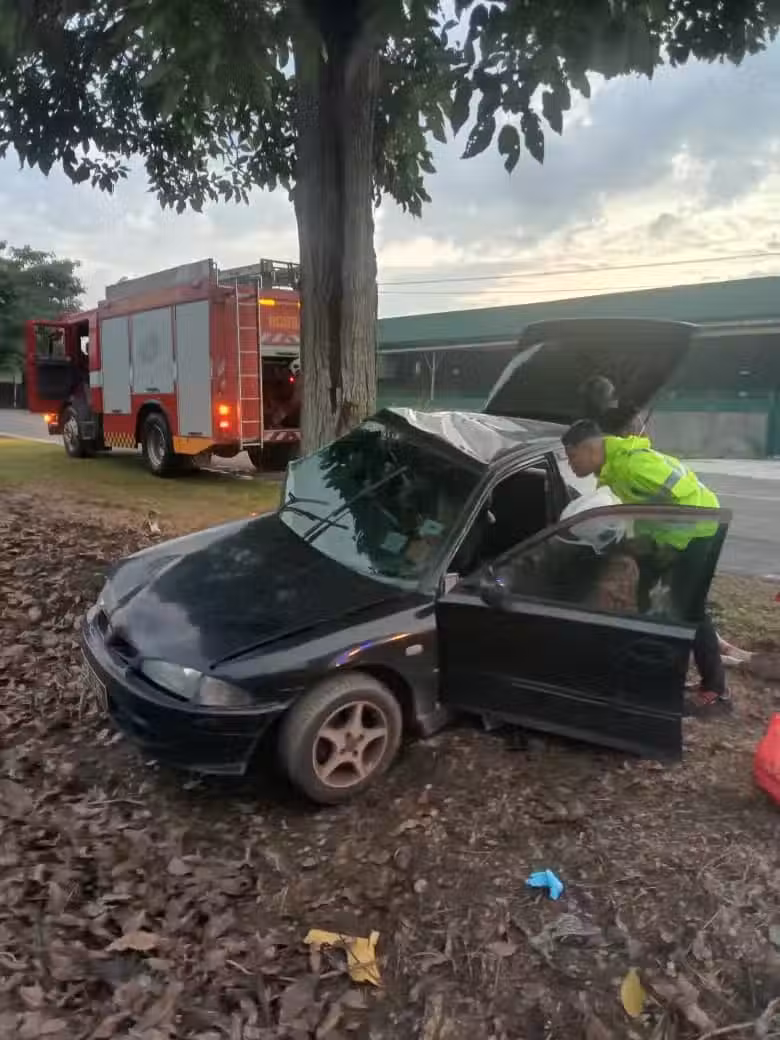 (哥打丁宜16日訊)華婦開車失控撞大樹,被夾斃車內。