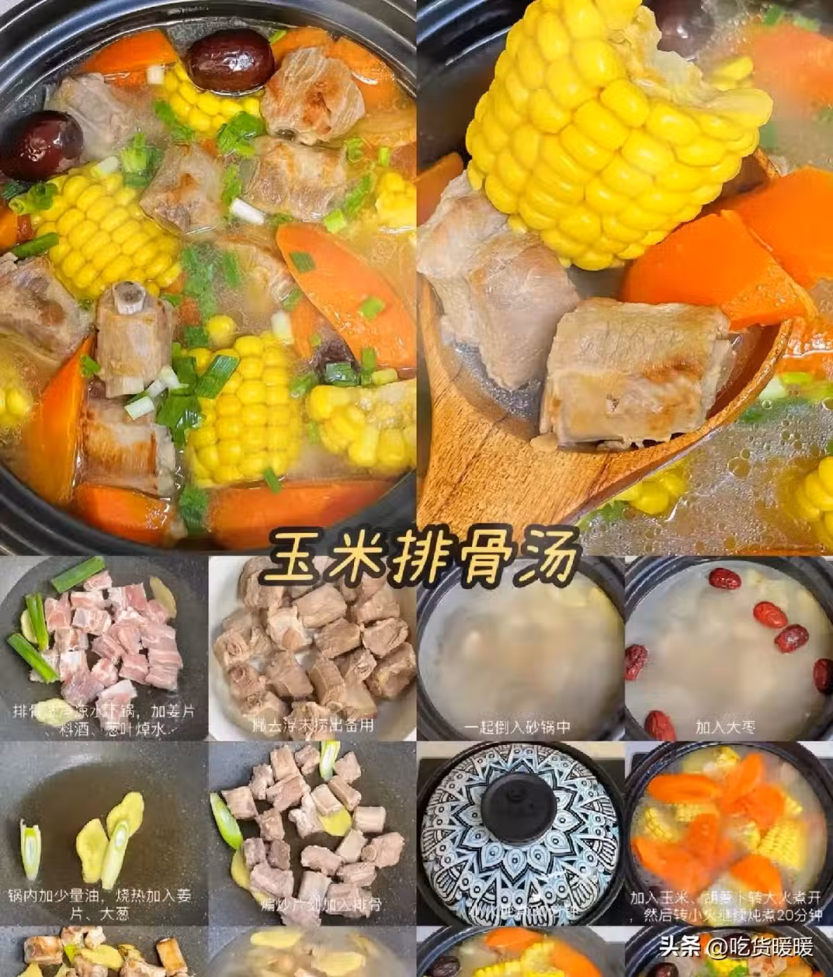排 料酒、蔥葉焯水 涼水牛鍋,加薑片 神去浮末撈出備用 一起倒入砂鍋中 加入大棗 鍋內加少量油,燒熱加入姜 加入玉米、胡蘿蔔轉大火煮開 片、大蔥 然後轉小火繼續燉煮20分鐘。