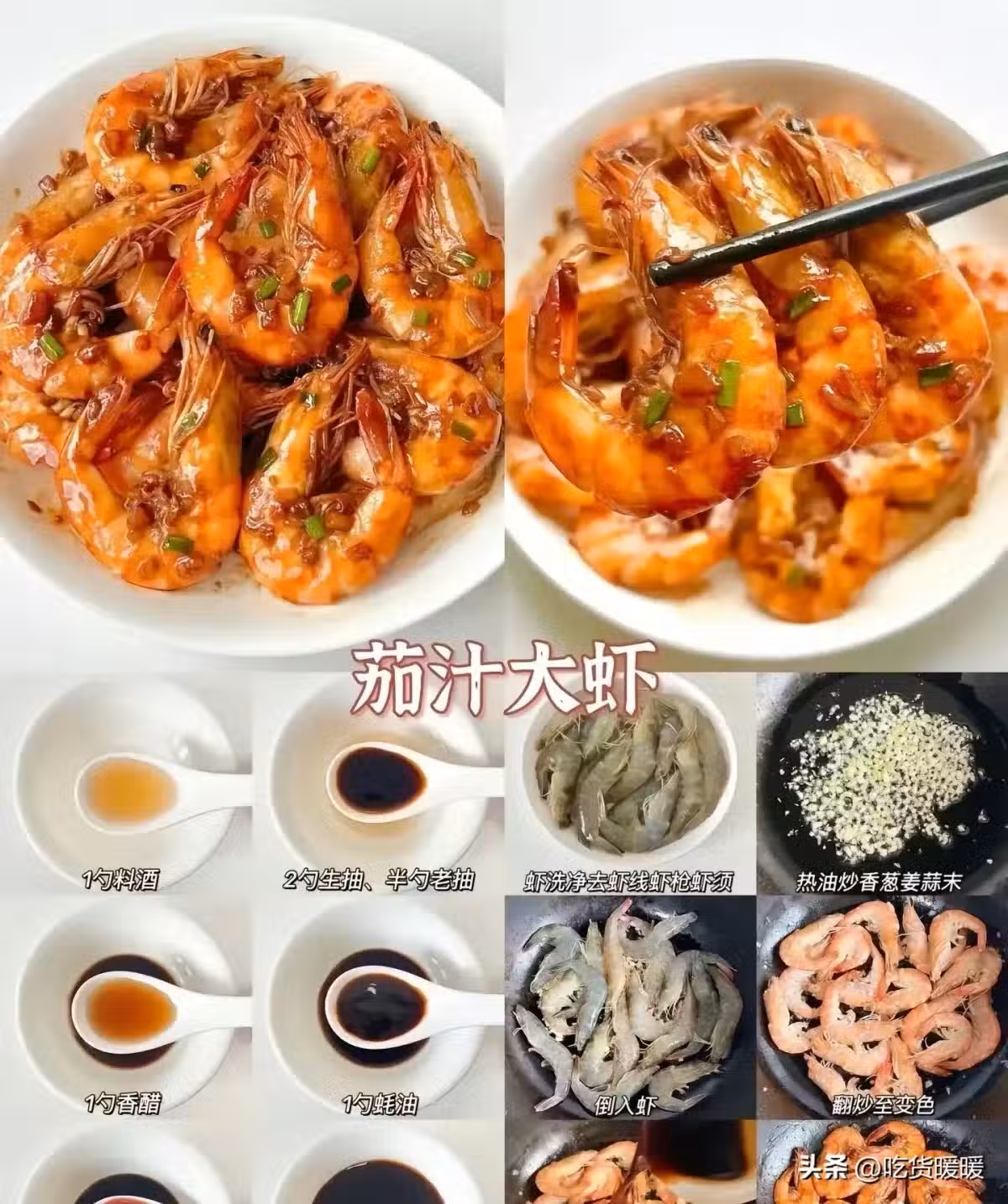 1勺料酒 2勺生抽、半勺老抽 蝦洗凈去蝦線蝦槍蝦須 熱油炒香蔥姜蒜末
