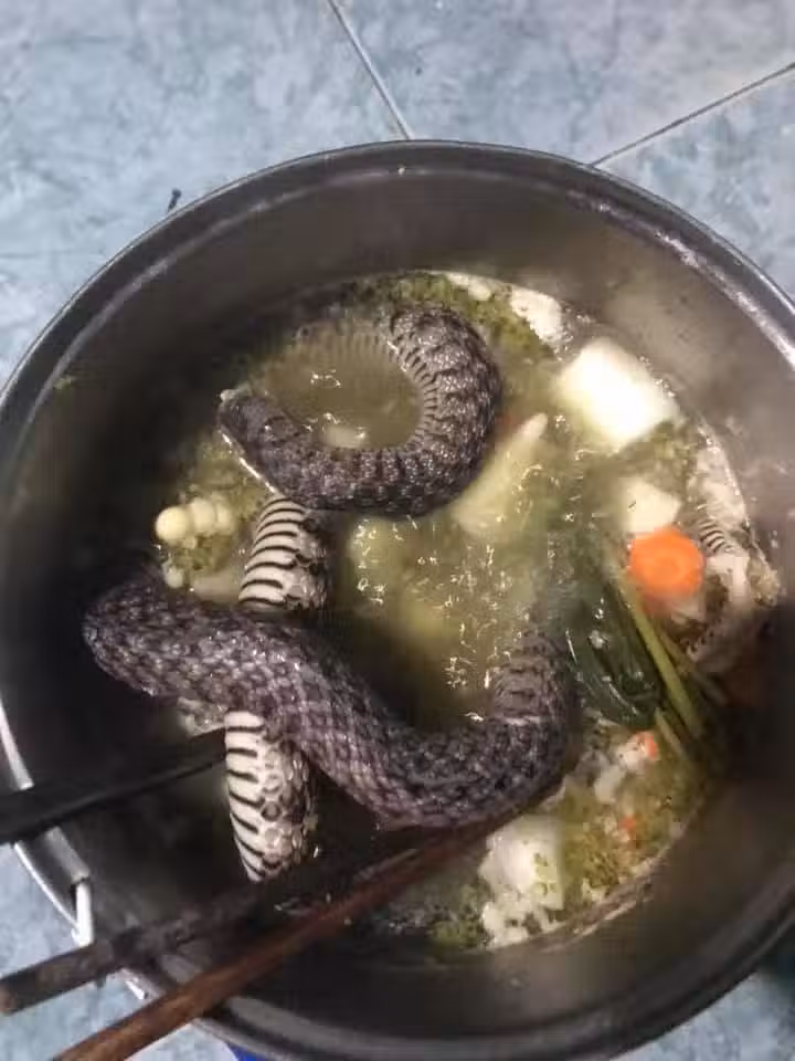 這群大學生都沒有宰蛇的經驗,不知道該如何料理,因此甚至連基本的剝皮、放血等步驟都沒有完成,就直接把整隻蛇丟到鍋子裡,再加上一些蔬菜、豆腐煮成一大鍋蛇湯,接著大家真的你一口我一口的分著喝完了!