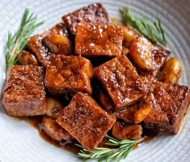 4、鍋中留底油,倒入煎好的豆腐和大蒜、迷迭香,翻炒至迷迭香冒出香味。倒入調好的料汁,熬煮至濃稠即可。
