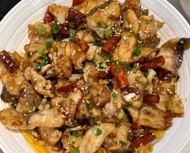 4、香料炒出香味後倒入魚,然後沿鍋邊來一點醋,撒上蔥花和芝麻就ok咯!喜歡吃辣的可以再來一點辣椒粉!如果有炸蒜的也可以放點!不敢想多香!看著油油的但是不會膩!