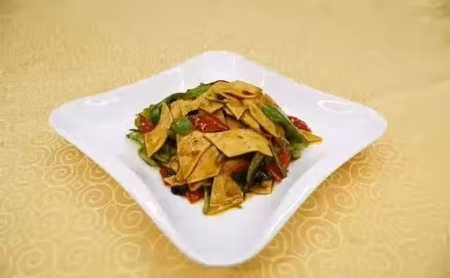 食材:青尖椒,豆皮,香芹,紅椒,豆豉,素蚝油,生抽,鹽,蘑菇精,白糖,生粉水