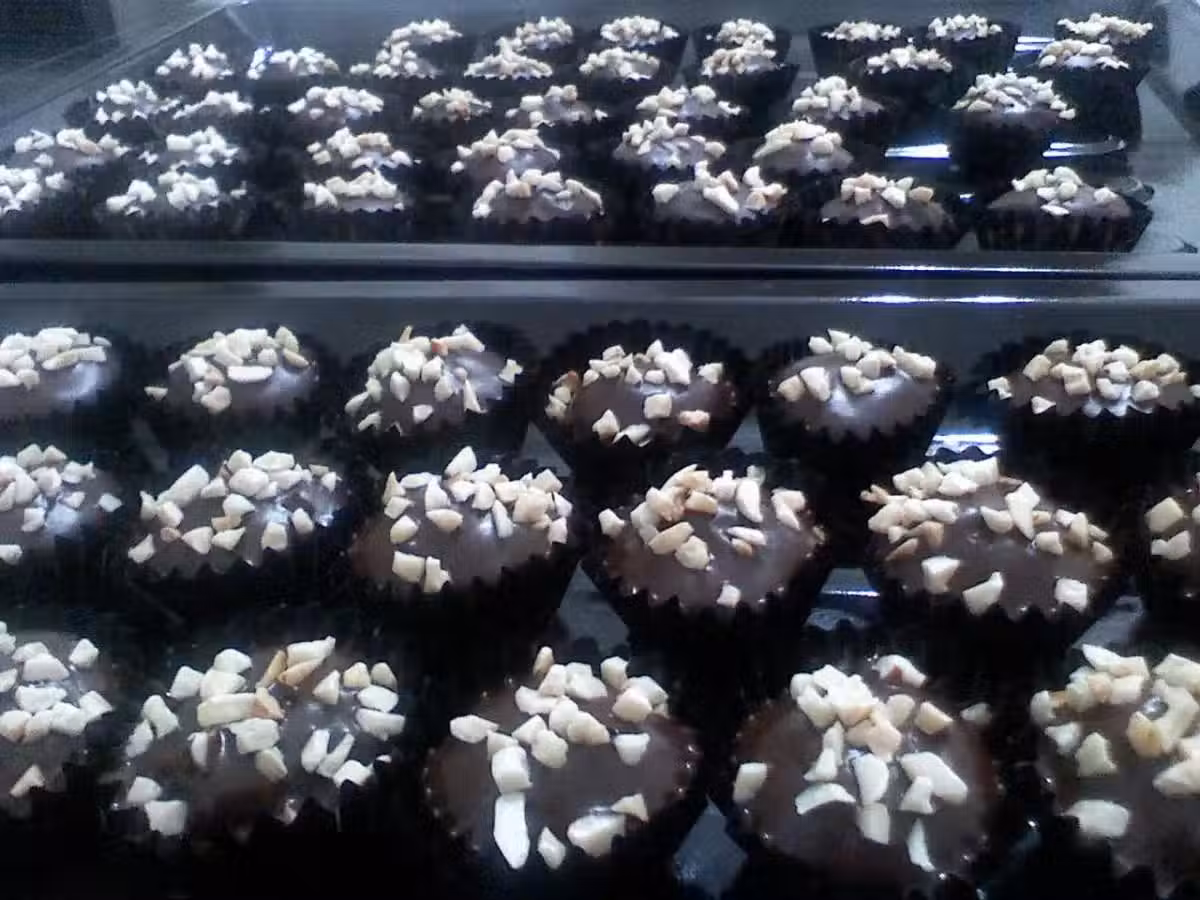 6.把餅乾放入巧克力糊, 再放入小紙杯, 然後在上面放上杏仁碎。