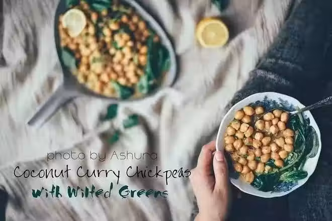 1. 鷹嘴豆提前泡水過夜,重分吸收水分,橄欖油里爆香; 2. 加入鷹嘴豆翻炒片刻,加水沒過豆子、加椰漿、咖喱粉、黑胡椒粉和鹽燉煮10分鐘; 3. 洗凈的菠菜去根,1/4個檸檬擠汁加入鷹嘴豆中,翻炒至菠菜軟身,出鍋。