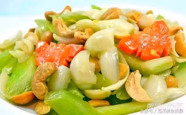 (1)西芹洗凈削皮,切成菱形塊;百合掰開洗凈;腰果用油炸熟備用;