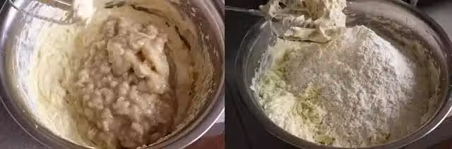 Add in mashed banana. Mix well with flour mixture, then add in milk.