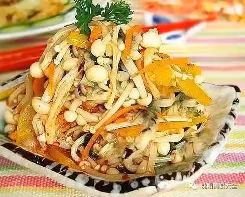原料:金針菇、黃甜椒、蔥段、生抽、香醋、香油、糖。