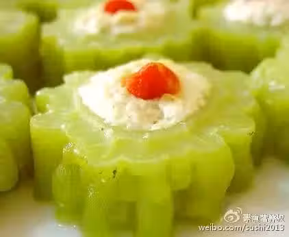 1、苦瓜洗凈,切成1-2cm的寬圓段,把中間的瓜瓤清乾淨,放入沸水中焯一下取出備用。