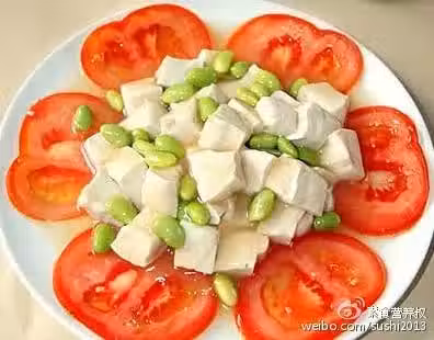 1、豆腐切小塊備用;番茄切片,圍盤邊擺一圈。