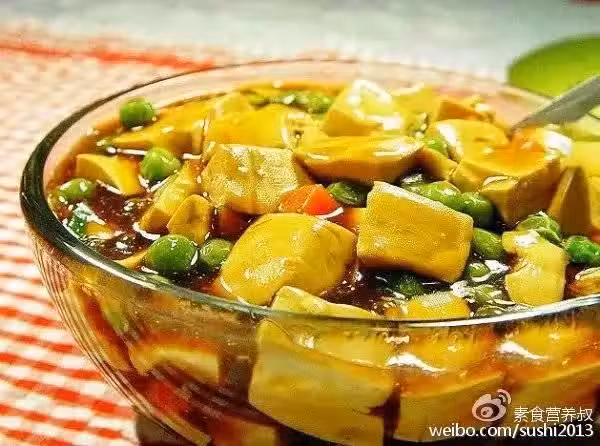 食材:豆腐一塊半,豌豆、胡蘿蔔丁少許,薑絲、味素、花椒水、醬油、白糖各少許