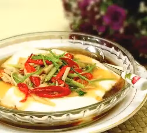 7、炒鍋燒熱加少許油,放杏鮑菇絲、紅椒絲、薑絲炒香,加少許水調味,加鹽、素得鮮(或蘑菇精)小香芹段勾一點點芡,滴幾滴橄欖油出鍋裝盤放在豆腐之上即可。