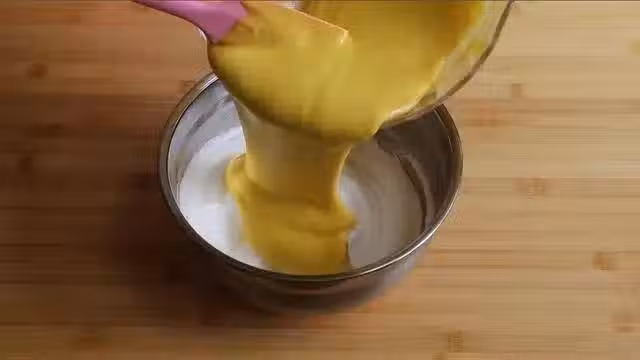 攪拌好的蛋黃倒在打發好的蛋清里