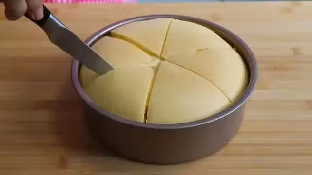 4.烤箱上下管160度預熱10分鐘,把蛋糕放在中下層,烤20分鐘後,帶上手套取出蛋糕,用刀把蛋糕輕輕的劃成六等份,不要用力劃,然後迅速放回烤箱,繼續烤40分鐘,沒有烤箱的也可以用電飯煲,蒸出來的效果也是一樣的。