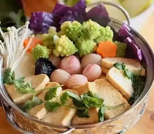 食材:老豆腐,櫻桃蘿蔔,紫甘藍,寶塔花菜,胡蘿蔔,黑木耳,金針菇,冬筍,香菜(可不加),紅薯粉絲,鹽,蔬果調味粉,胡椒粉