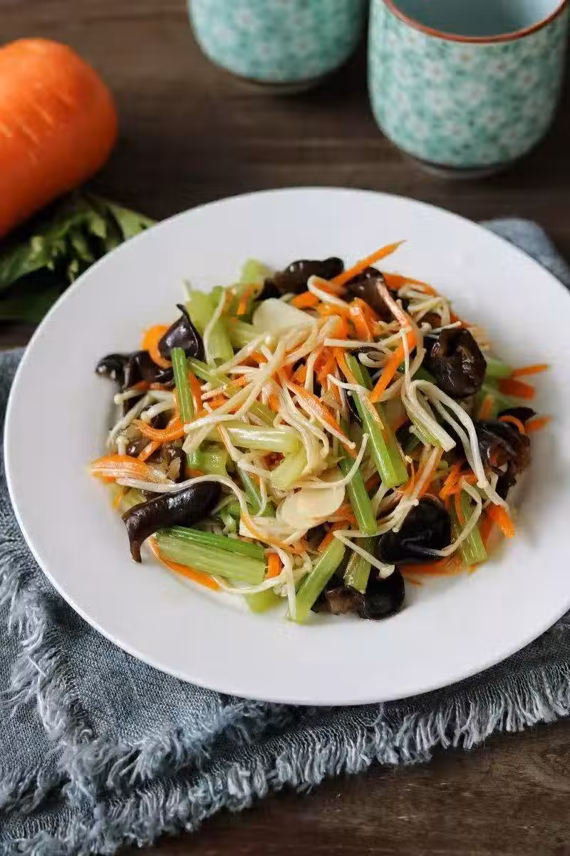 1. 木耳泡發,菜洗凈,胡蘿蔔切絲,芹菜切段;2. 放入沸水焯半分鐘,撈出浸入冰水,輕輕擠去水分;3. 木耳也焯一下,撈出過涼;4. 全部放入大碗中,加入調料拌勻;5. 鍋中熱油,加入薑末炸香;6. 澆在蔬菜上面拌勻即可。