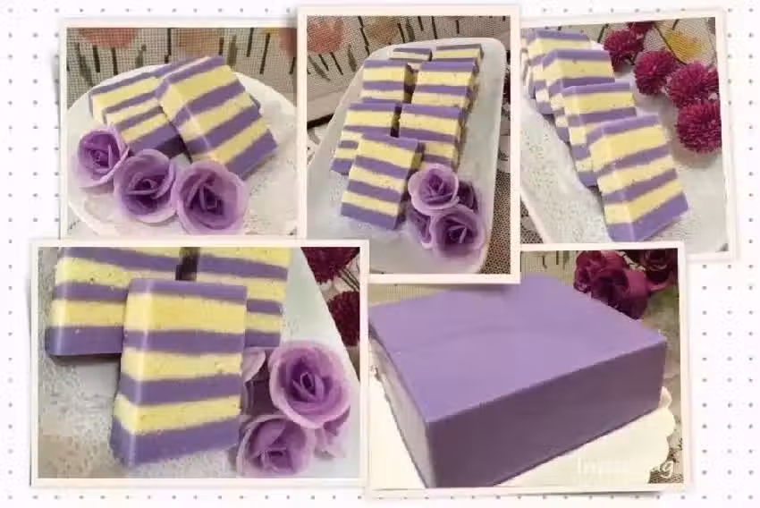 6) 將1/4 的Yam 咖椰料倒入7 寸模里,放上一片蛋糕,重複步驟至完,待冷後放入冰箱約4小時後脫模。再做裝飾。
