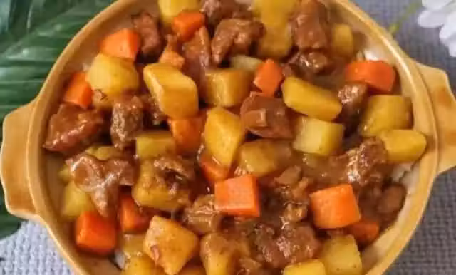 3、加入土豆塊,胡蘿蔔塊,繼續燉至土豆軟爛,加入咖喱塊,再燉2分鐘即可。