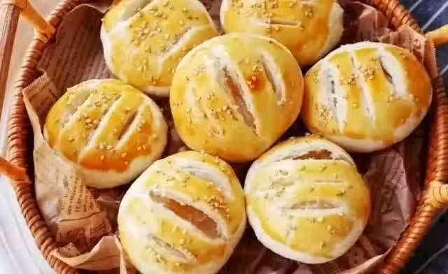 3、刷上蛋黃液,用刀再餅面上劃三刀,撒上白芝麻,空氣炸鍋預熱180度烤15分鐘,中間翻面完成。
