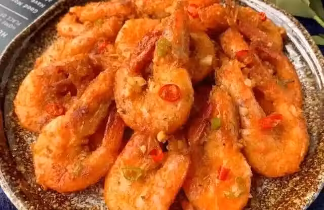 2、熱鍋放油,放入蝦炸至金黃撈出,留底油爆香蔥段蒜末、青紅椒,再放入蝦翻炒均勻,出鍋撒上椒鹽粉即可。