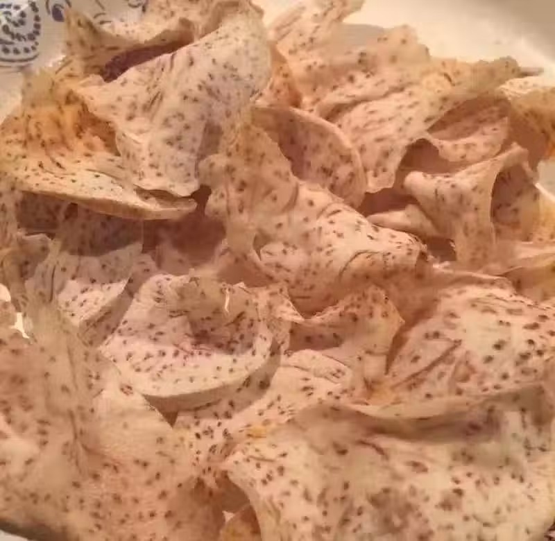 1、芋頭切薄片,在小碗里放少許油、鹽、糖,拌一下。只要一點點,因為芋頭本身味道就很香