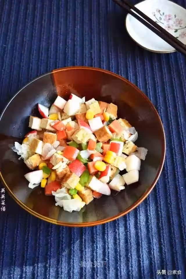 5、水蘿蔔切丁,滷好豆腐撈出切丁同熟玉米、芹菜、胡蘿蔔、銀耳共置一容器倒入味汁拌勻即可。