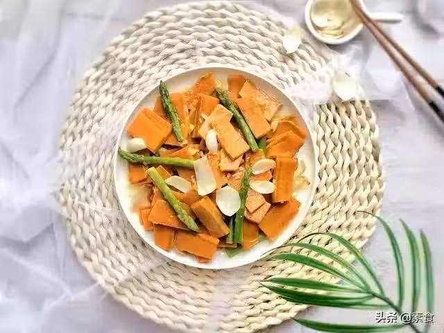 7、倒入南瓜和蘆筍翻炒均勻