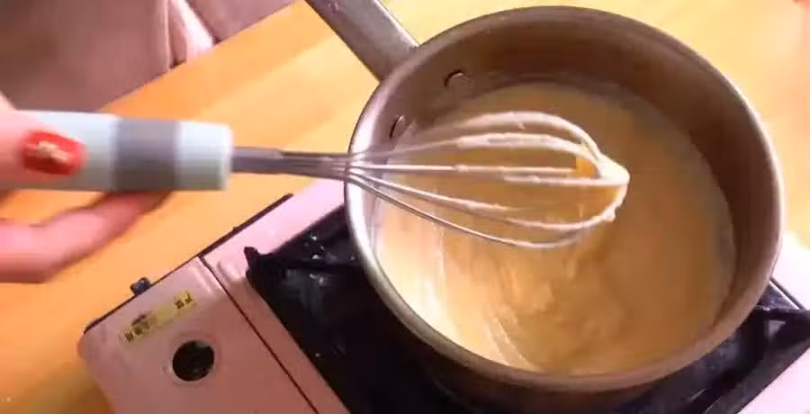 然後擀得薄薄的備用,卡仕達醬用裱花袋裝好,擠在糯米皮上,兩三圈就夠了。